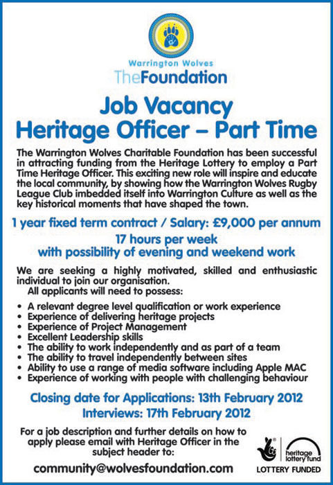 One of the main roles of the officer will be to coordinate the implementation of an interactive timeline that will be based within the South Stand at the Halliwell Jones Stadium. Local volunteers will deliver tours so that everyone has the opportunity to see the new structure, and not just those who attend match days.
