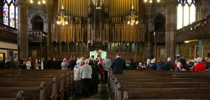 Since then, a service to commemorate this has been held on the first Sunday of October . This year saw 20 Mayors and 3 Lord Mayors, their deputies and consorts gather in the town with representation from as far afield as Carlisle. The retinue included the Mayor of Warrington, Cllr. Les Morgan, the Depty Mayor Cllr. Karen Mundy, Leader of the Council Cllr. Terry O’Neill and W.B.C. Chief Executive Stephen Broomhead. The Lord Mayors of Liverpool, Chester and Lancaster were also in attendance.