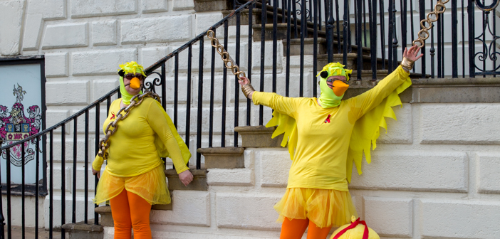 Protesters, including two large yellow canary suited cheerleaders, symbolically chained to the Town Hall gate, sang and chanted whilst the full Council meeting took place.