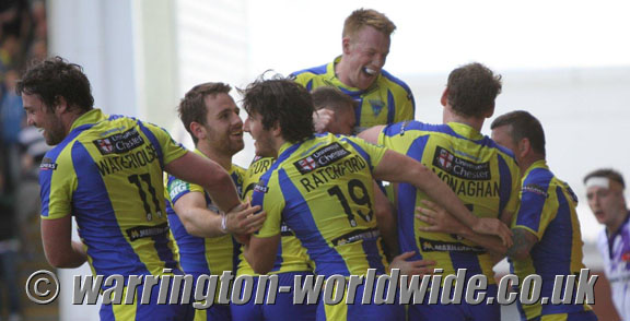 A hat-trick of tries from Bennie Westwood helped Warrington Wolves romp to victory 68-10 over Salford City Reds at the Halliwell Jones Stadium.